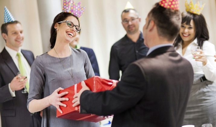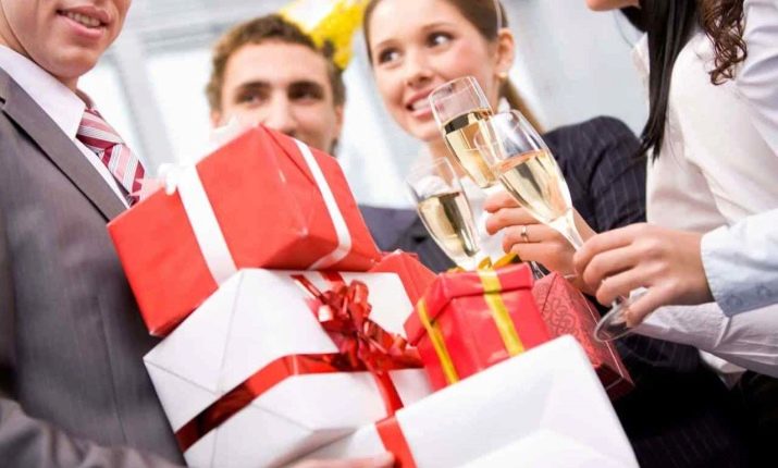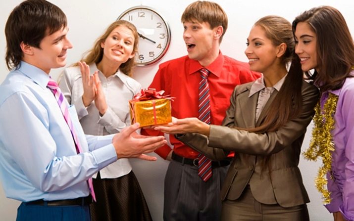 Universelle gaver-komplimenter, der gives til kolleger på arbejdet, inkluderer normalt elite-alkohol, inklusive champagne, alderen vin, whisky, rom og spiritus, samt håndlavede slik (temasæt, sæt med antal og ønsker er især værdsat). Og også ofte præsenterer teamet en fødselsdagskage.