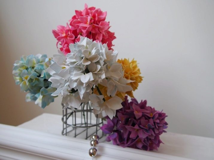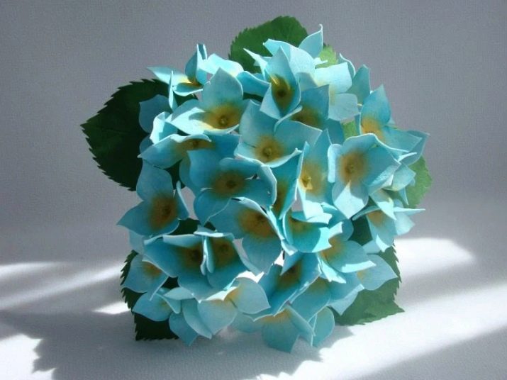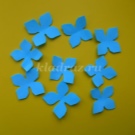 I dette tilfælde samles håndværket fra et emne med fire kronblade.Dette letter arbejdet meget og sparer tid. Kombiner flere blomster i en sammensætning for at få en frodig og lys buket med kunstige hortensiaer.