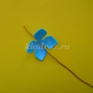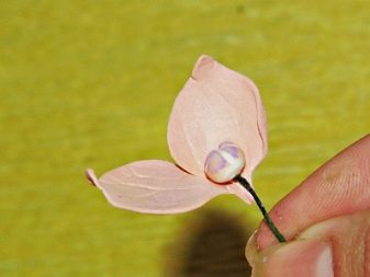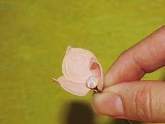- Forbind de to elementer sammen. Lim det første kronblad på de tidligere høstede stængler. Brug en varmepistol eller anden effektiv sammensætning. Lim følgende del på samme måde. Dekorer knoppen, så kronbladene på modsatte sider er overfor hinanden.