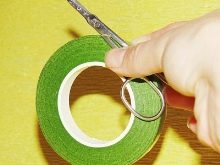 - Dernæst skal blomsten og bladet omvikles med båndtape. Denne proces demonstreres tydeligt på de billeder, der er knyttet til den første mesterklasse.