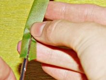 - Nu skal du dekorere hortensiastammen. Tag det grønne bånd. Skær det i 2 strimler i midten. Begynd at indpakke stammen af bunden af knoppen til bunden. Tryk fast på båndet.