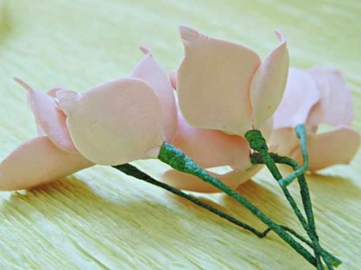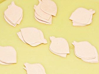 - Nu skal emnerne gives udtryksfuldhed. Forme er nyttige her. Tænd for strygejernet, opvarm det, og påfør hvert enkelt element individuelt på sålen. Efter et par minutter påføres en varm foamiran-detalje på formen og pres. Brug betjening af silke under drift.