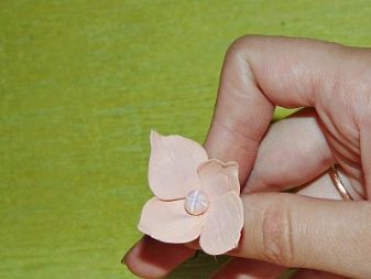 - Nu skal du forbinde kronbladene til kernen. Vi fører de færdige stamens gennem midten af blomsten. For at gøre hortensia mere storslået bruges to elementer af et porøst materiale til en stamen.