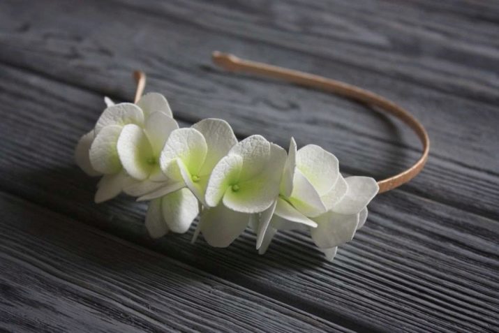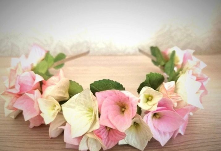 - Delikat hårbånd med lyserøde hortensiaer. Et sådant tilbehør kan præsenteres som en præsentation.