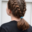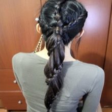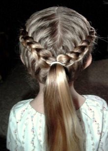 For grundskole og gymnasium som en daglig frisure, kan du overveje mulighed for at skabe en figur på otte fra langt hår. At realisere ideen er meget enkel, for denne halevæver, hvis ender samles i fletninger. Derefter samles pigtails i en knude på bagsiden af hovedet, og enderne fastgøres ved baserne af de modsatte haler. Du kan bruge et bånd midt i vævet, hvilket gør det lettere at fastgøre enderne på fletningerne.
