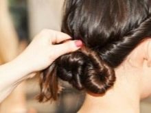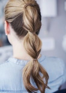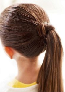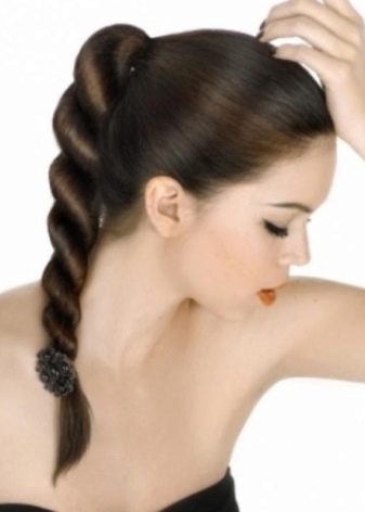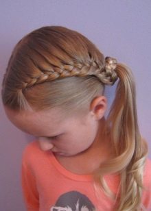 En anden idé til en frisure fra en lang hale kan være styling fra en hestehale, der er snoet gennem midten, hvorfra en almindelig eller omvendt fletning derefter samles. Og hun på sin side er snoet ind i en rulle og fastgjort med stænger eller mesh ved bunden. Det vil være muligt at dekorere frisyren med enhver hårnåle eller bånd, der passer til skolen.