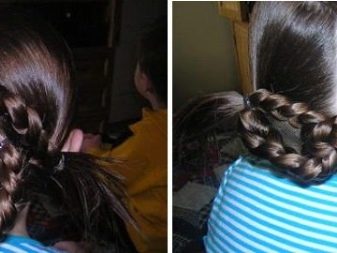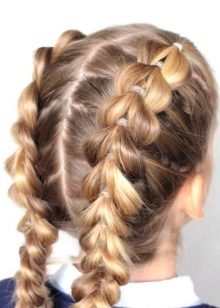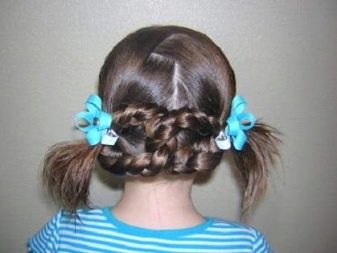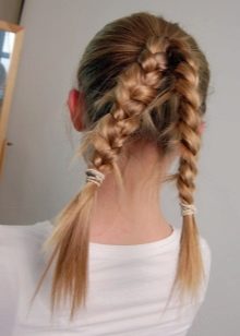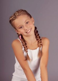 Enkle to fletninger kan diversificeres ved vævning. For tykt og langt hår skal du bevæbne dig selv med evnerne i tysk volumetrisk oprettelse af to fletninger på hver side. Denne hårstyling vil være universal, derfor velegnet til ungdoms-, mellem- og gymnasium. Buer kan bruges som dekorationer, bånd kan også væves til pigtails.