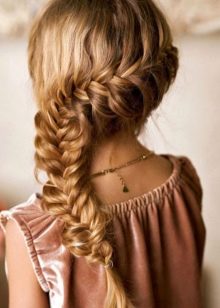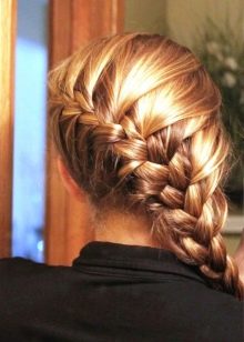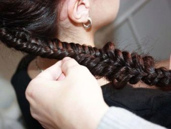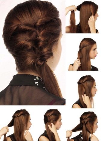 Først og fremmest vil det gå Fransk eller omvendt fletning. Vævning skal begynde fra den modsatte side af kronen og flytte til den anden side fra bunden. Derudover kan fletningen flettes langs hele længden, eller du kan stoppe ved halsniveauet, ved at fastgøre håret med en hårnåle eller elastik, og lade enderne være med sidens hale. For at skjule tyggegummiet skal du bruge en streng, der er indpakket i en cirkel omkring basen.