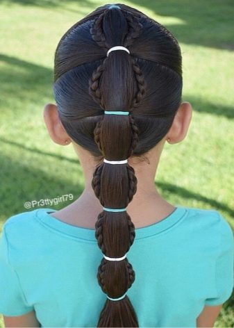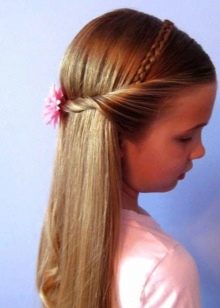 Ud over den sædvanlige fletning, to fletninger eller hale, med hvilke mødre pynter hovederne til piger med langt hår, skal du bruge mere original styling, som også svarer til den officielle skolestil. Hvad angår den enkleste mulighed - halen, i dette tilfælde, kan du slå en lys frisure, hvis hestehale vil bestå af fire eller flere fletninger. Det viser sig også at samle håret på hver side i 3 symmetriske haler, flettet fra dem, som derefter kan lægges smukt rundt om basen ved hjælp af usynlige blomster. Frisuren udføres meget hurtigt, men den ser original ud.