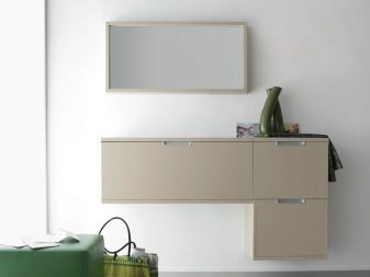Monterede sorter skal yderligere fastgøres til vægoverfladen, og som regel berører selv store størrelser ikke gulvets overflade. Sådanne design er relevante for små gange, fordi takket være sådanne funktionelle møbler vil det være muligt at lægge en osmannisk under det, placere et skoholder, skuffer eller ethvert andet nyttigt design, hvilket sparer værdifulde meter i rummet.
