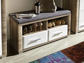 Lukkede skabe med et blødt bænk vil komplementere korridoren, men på samme tid skjuler de ikke kun sko, men også større ting indeni, såsom en paraply eller andre husholdningsartikler.