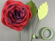 Du kan finde ud af, hvordan man laver en stor rose af bølgepapir ved at se videoen.