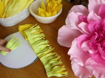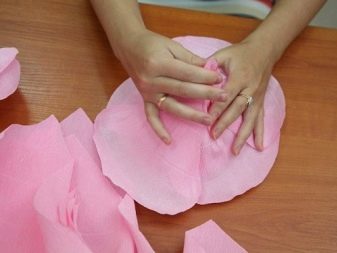 Størrelserne på kronbladene kan være forskellige, men det er bedre at lave dem i området fra 1,5 til 14 cm. For at få virkelig enorme blomsterstande i størrelse, er det nødvendigt at forberede mange emner - mindst 10 stykker i hver størrelse. Små kronblade skal fordobles. Det er nødvendigt at begynde at arbejde med dem - du skal anvende en varm limopløsning og derefter folde dem og give det ønskede udseende. Du bliver nødt til at gå videre i en lignende retning og tilføje lydstyrken.
