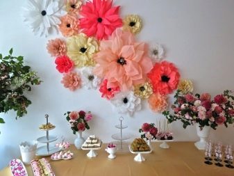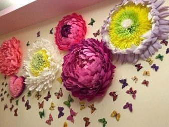 Du kan lave et meget smukt og storslået blomsterarrangement på væggen. Således kan du oprette en hel lysfotosone, imod hvilken du kan tage fantastiske billeder, hvis du vil have en interessant fotoseanse. Selve knopperne til en sådan sammensætning kan laves efter samme princip som de ovenfor beskrevne muligheder. Men permanent fastgørelse i dette tilfælde er overhovedet ikke nødvendigt, for med tiden vil knopperne uundgåeligt begynde at samle støv, eller du ved et uheld kan rive dem af.