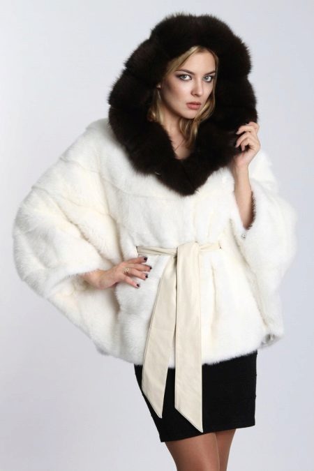 Bygget på kontrasten fra hvid minkpels og sort sabel, denne auto-iscoat ser både funktionel og spektakulær ud. Blondt hår drager kun fordel af farven på hætten, og et stilfuldt bælte bundet med bevidst uagtsomhed giver billedet et naturligt look.