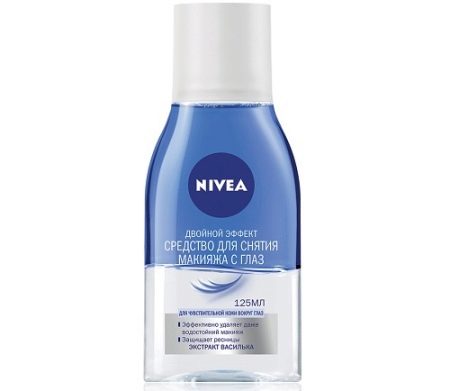 - "Dobbelt effekt" fra Nivea - Dette er det mest populære værktøj, der kan håndtere fjernelse af dekorativ kosmetik. Den præsenterede tofasevæske indeholder nærende og fugtgivende komponenter, der kan bevare ansigtshudens ungdommethed. Før brug skal dette produkt omrystes grundigt for at blande de to flydende faser med eksponering.