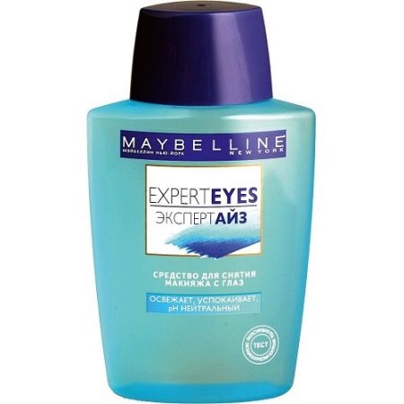 - Maybelline ekspert øjne - Det er et effektivt middel med en neutral pH-værdi, som hjælper med at slippe af med dekorativ kosmetik uden problemer. Selve værktøjet er enfase, har en blå farvetone. Når den påføres en bomuldspude, skummer den let.