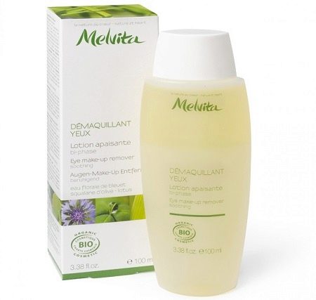 - Demaquillant YeuxLoyion Apaisante af Melvita - Dette er et organisk produkt, der let kan fjerne enhver form for makeup i ansigtet. Hvis man ser nøje på, bliver det klart, at der findes en minimal mængde olie i væsken, hvilket bidrager til mildere hydrering. Den tid, det tager at fjerne makeup, øges dog lidt. Med enkle ord skal en fugtet bomuldspude påføres øjenvipper i 5-7 sekunder. Derefter fjernes et dekorativt pigment omhyggeligt med en flick af håndleddet.