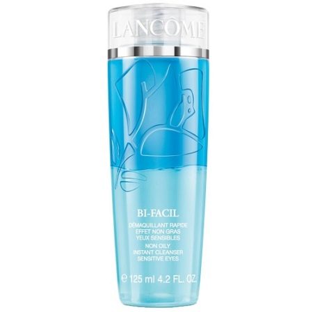 - Lancome tilbyder kvinder en to-fase lotion, der kan bruges både til at fjerne generel makeup og til at fjerne vandtæt mascara fra øjenvipper. Sammensætningen af lotion er hypoallergen. Det kan bruges af damer, der bærer kontaktlinser. Før påføring omrystes lotion grundigt for at blande forskellige faser af handling. Vådskiver fugtes med en blandet væske, som skal påføres i et par sekunder på øjnene, hvorefter dekorativ kosmetik fjernes med en let bevægelse af hånden.