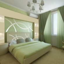 Accentvæggen bag sengen i det rummelige soveværelse kan males i riggrønt og alle andre overflader i fløde, mælk eller hvid. Det er bedre at gøre gulvet i et sådant rum lys og lægge på det et blødt tæppe med delikat græsfarve. Tætte grønne gardiner skal hænges på vinduerne, og en hvid dobbeltseng skal suppleres med en grøn plaid med hvide puder. På natborde er det bedre at lægge enkle hvide lamper. Indstillingen er ideel til afslapning.