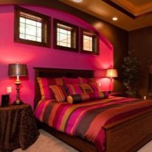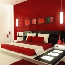 Mættede farver af bordeaux eller rød er en meget dristig beslutning. Du kan ty til det i dekorationen af accentvæggen, der ligger bag hovedet af sengen. De resterende vægge i rummet skal indsættes med kaffefarvet tapet med et naturligt udskrivning. Loftet skal være hvidt, og der skal lægges et laminat- eller parketplade i en mørkebrun skygge på gulvet. Dette passer til en mørk seng med hvide puder, lysarmaturer, levende planter på natborde.