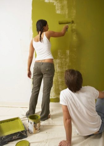 Hvis der bruges en simpel hvid vandbaseret emulsionsmaling med farve under farvning, skal du forberede en tilstrækkelig mængde farveløsning til færdigbehandling. Hvis blandingen pludselig ikke er nok, vil det være utroligt vanskeligt at gentage den samme nuance af den forberedte sammensætning. Som et resultat vil farven på væggene i soveværelset vise sig at være anderledes.