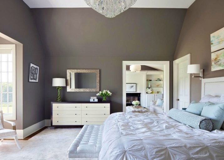 Væggene i soveværelset kan males med lysegrå maling. Så at interiøret ikke synes for trist og ensformigt, bør loftet gøres hvidt, et snehvidt tæppe skal lægges på gulvet, og en stor lys seng med lyseblå puder skal placeres. Kommode i et sådant moderne soveværelse kan kombinere mælkeagtige og mørke farver.