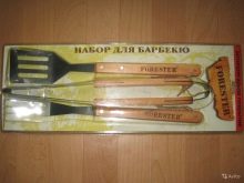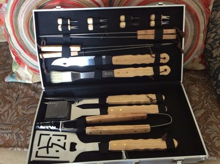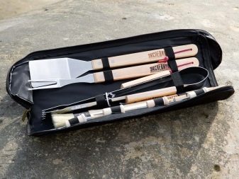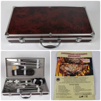 - Billig økonomi inkluderer alt uundværligt: flere spyd, trådstativ, spatel, gaffel. Sådanne sæt pakkes i et plastikhus med et håndtag eller i en trækurv, der ser mere organisk ud.