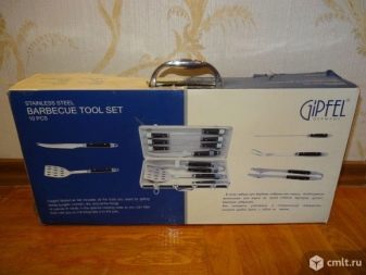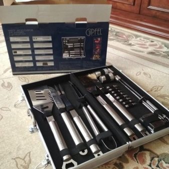 Gipfel anbefaler et klassisk sæt af et sæt fra 3 varer til stort til 6 personer. Dette er forskellige grillrister, rengøringsbørster, spyd, drejeblade, perforerede pander, tridentstik, tekstil- og silikonkroge og meget mere. Sortimentet er ret rigt. Varer opbevares i aluminiumskasser for ordentlig opbevaring og bekvemmelighed. Alt materiale er skabt af miljøvenlige råvarer - det er kulstofstål, rustfrit stål, silikone og træ. Hvert produkt er certificeret.