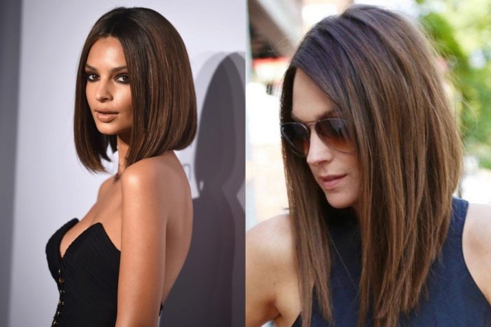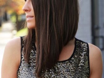 En firkant med strenge, der strækkes ud til hagen, er velegnet til ejere af lige hår. Præcise trimmede volumetriske krøller forlænges markant ved hagen, med denne form for frisure kan du glatte vinklede ansigtstræk eller visuelt strække et rundt ansigt.