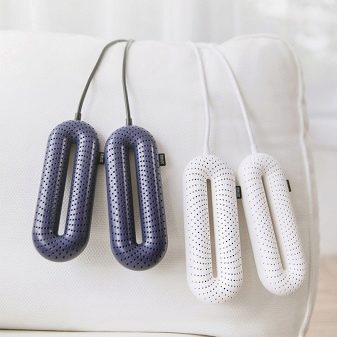 Du kan ændre den traditionelle hvide farve ved køb og vælge fra sortimentet blåt eller lyserødt, der kan købes. Enheden er en lang ledning, der er delt i to, og selve tørretumblerne er installeret i dens ender: langsgående elementer, der passer i enhver sko.