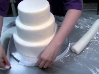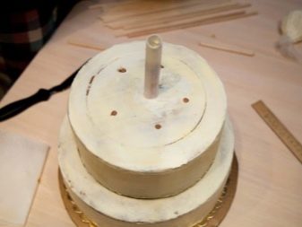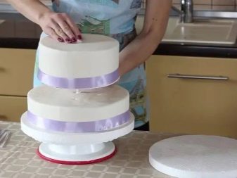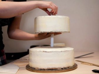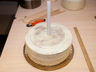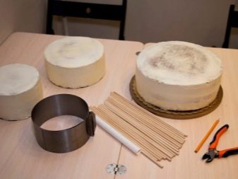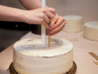 At samle en flerlags bryllupskage kan oprindeligt virke som en hel videnskab, men du kan let håndtere den selv. Der er flere enkle manipulationer, der gør det muligt for de øverste lag ikke at skubbe de nederste lag, samtidig med at stabiliteten for hele strukturen bevares. For at begynde skal du installere hvert lag af kage på specielle papirunderlag. Lav et lille hul (i midten) i bunden af hvert underlag. For stabilitet bruges cocktailrør og en tynd træstokk. Sidstnævnte skal være tæt indpakket i klamfilm.