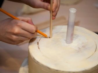 Efter dette skal du hurtigt indsætte en træpind i midten og rørene i andre huller. Det er også nødvendigt at hælde chokolade i hulrummet i rørene. Dette vil fastgør bunden af den øverste fase. Når chokoladen er hærdet, skal du sætte det øverste lag ved at placere det på en træpind. Gentag proceduren for alle efterfølgende lag.