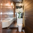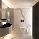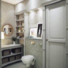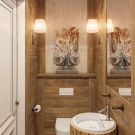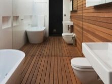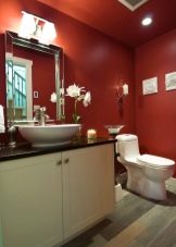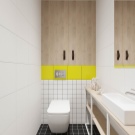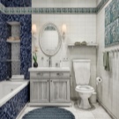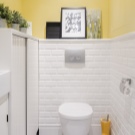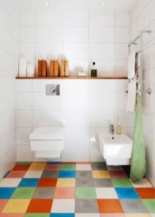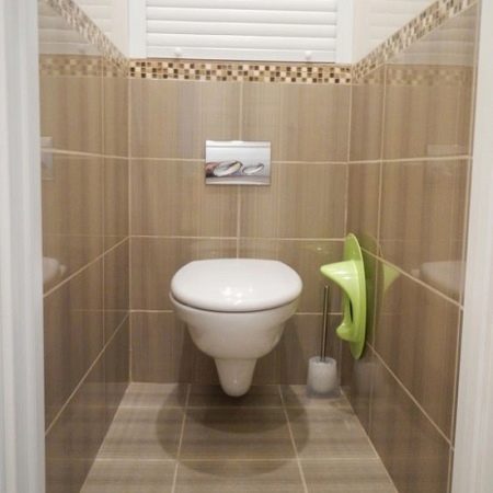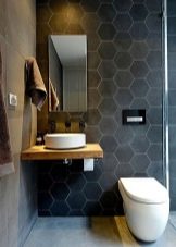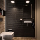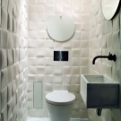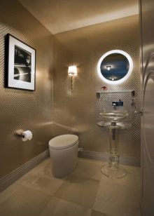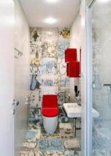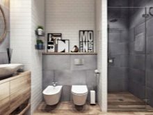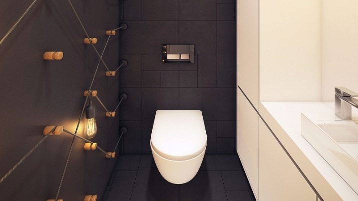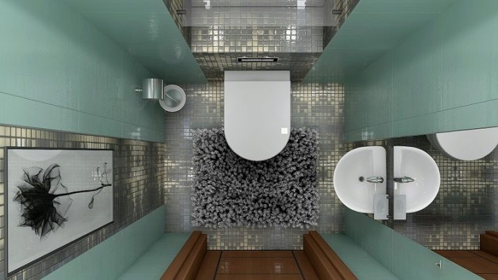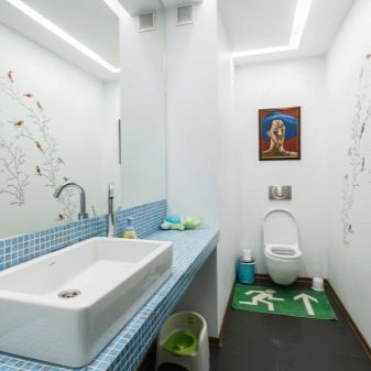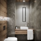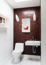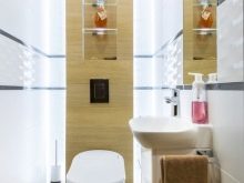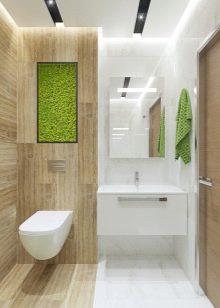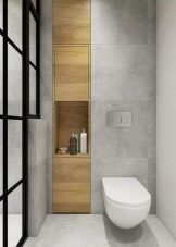 - Visuelt kan toiletrummet gøres bredere. For at gøre dette anbefales det at opdele det i forskellige zoner ved hjælp af efterbehandlingsmaterialer i forskellige strukturer og farver.