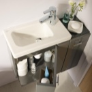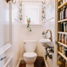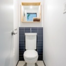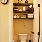En god løsning ville være reol kombineret med en toilettank. Bag spejlet i rummet er det muligt at skjule yderligere hylder.