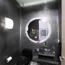- Badeværelset vil se stilfuldt og usædvanligt ud, hvor gulvet bliver færdig i mørkt træ, og væggene vil se ud som mursten og planker. I en sådan ikke-standardindstilling bør der installeres kontrasterende lette hygiejneartikler - en hvid monolitisk toiletskål med en blank overflade, en hængslet rund håndvask. Ovenfor sidstnævnte kan du hænge et lille rundt spejl med en diskret grålig ramme.
