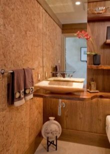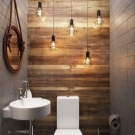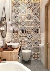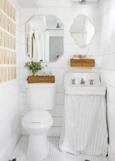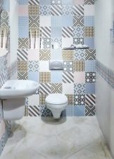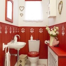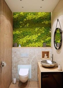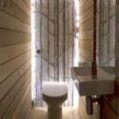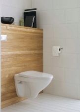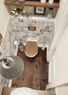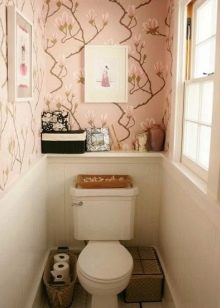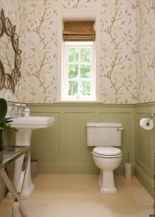 - Kombinationen af materialer. Det indre af toilettet ser interessant og livligt ud, hvor flere forskellige materialer bruges til vægdekoration. For f.eks. Væggens paneldel kan du bruge mere holdbart materiale og til den øverste del - mindre slidstærk og stærk, men mere dekorativ mulighed.