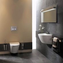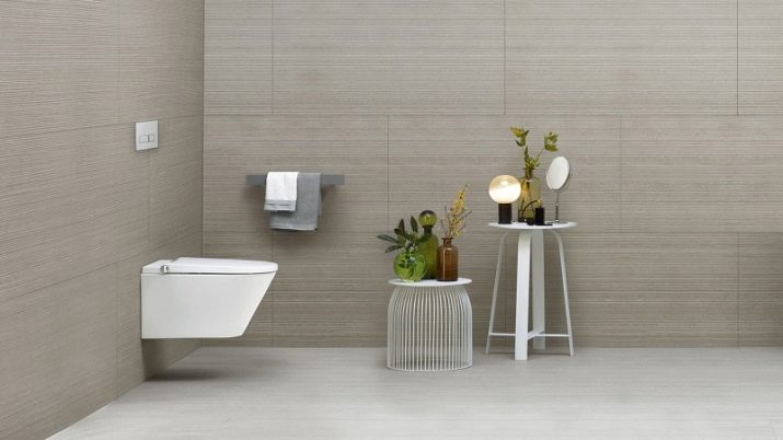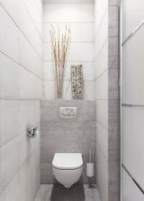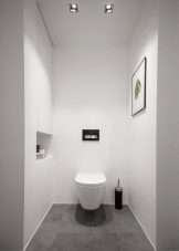 - Mange mennesker foretrækker at gøre toiletindretningen så diskret som muligt.. For at gøre dette kan rumets vægge og gulv afsluttes med materialer i neutrale grå toner. På baggrund af en sådan baggrund vil et hvidt vægmonteret toilet med en skjult cistern, en rektangulær formet vægmonteret håndvask, metalhåndtag, knapper og tilbehør samt et simpelt spejl over serviet harmonisk se ud.