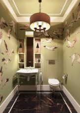 - Toiletter dekoreret i hvide og grønne farver ser pænt og pænt ud. For at gøre dette kan du vælge de rigtige plastpaneler af høj kvalitet eller fliser. Bunden af væggene og gulvet skal være lysegrøn, og toppen skal være hvid. Fortyndede udskrivninger af geometriske former på en hvid baggrund fortynder finishen.
