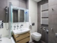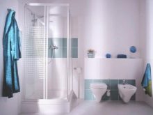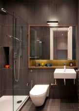 Den ideelle løsning til et kombineret badeværelse vil være indbygget bruser med glasvinger. Under dette design kan du tage den ene halvdel af rummet, adskille det med en skillevæg, bag hvilket der er et sted til et toilet og et bidet (de vil besætte den anden halvdel). Et skab med en håndvask og et spejl kan placeres mod væggen på afstand af VVS. Hvis dimensionerne på badeværelset ikke er så beskedne, er det muligt at installere et stort stationært brusebad og lægge et bidet og et toilet til højre eller venstre for det. I dette tilfælde vil der i et rummeligt langt rum være nok plads til et skab med vask.