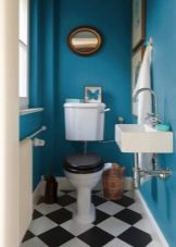 - Paint. Nogle husejere foretrækker at bruge vægmaling i designet til toilettet. Denne beslutning anvendes normalt til, hvis det ikke er muligt at lægge fliser eller PVC-paneler på væggene (kassen til sidstnævnte vil optage ekstra plads). Vægge til fremtidig maleri skal være omhyggeligt forberedt: slippe af med huller, buler, revner. Justering udføres ofte ved at installere fugtbestandigt gipsplader. Hvis væggene i rummet allerede er perfekt lige og pæne, kan du gøre det uden forudgående justering.