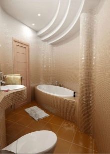 - Til badeværelset "Khrushchev" er det ideelle efterbehandlingsmateriale mosaik.I sådanne boliger er der særlige afrundede hjørner, der let er færdige med fine fliser.