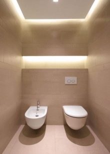 I et lille toilet er der ikke nok en lysarmatur. Selvom rummet er meget lille, vil en lampe ikke være i stand til at belyse absolut al den plads deri. Den ideelle løsning er mini-pærer. De er indlejret i den centrale del af loftbunden eller langs en lang række. Som ekstra belysning kan en lampe over spejlet eller gulvbelysningen tjene. I tilfælde af GKL loftdekoration kan du ty til installation af LED-strimler.