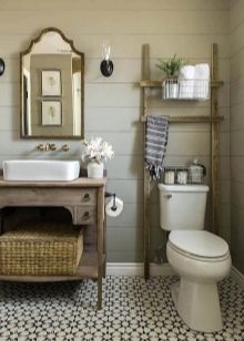 - Provence. I et sådant toilet skal du overholde et roligt pastelfarveprogram. Alle detaljer skal være delikate og elegante. Rummet skal udstråle lethed. Det er værd at tilføje linnedklæder, mosaikker til det indre, små malerier, diskrete ornamenter, blomster er acceptabelt.