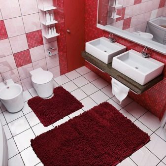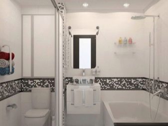 Meget afhænger af det kombinerede badeværelses område. Selv i et meget lille rum er det muligt at placere alle de nødvendige detaljer og gøre dem på samme tid attraktive. Så under forhold med begrænset rektangulær plads kan du installere en hængende håndvask med et spejl i midten af den længste væg og placere en toiletskål og et badekar ved de to ekstreme vægge (i stedet for et almindeligt badekar er det acceptabelt at bruge en jacuzzi med et vinkelt design og små dimensioner).