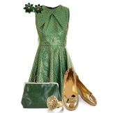 En charmerende kjole i klassisk længde, flared fra hoften, tiltrækker med sin usædvanlige farve, som er så rødhåret pige - en kombination af striber af smaragd og gylden farve. I den øverste del af produktet er strimlerne endvidere placeret vandret, men fra hoften er de langsgående, hvilket visuelt bygger den nedre del af kroppen. Det perfekte supplement til dette outfit er pumper i farve guld, dekoreret med flørtende buer. Modellen har en interessant konisk hæl af mellemhøjde. En tynd stropp i taljen, der svarer til skoens farve, gør billedet mere holistisk.