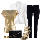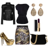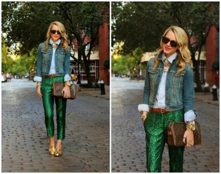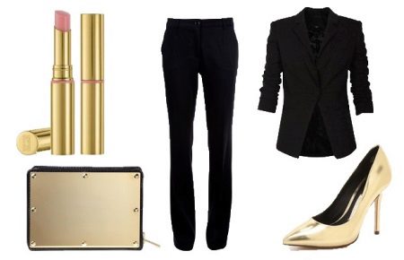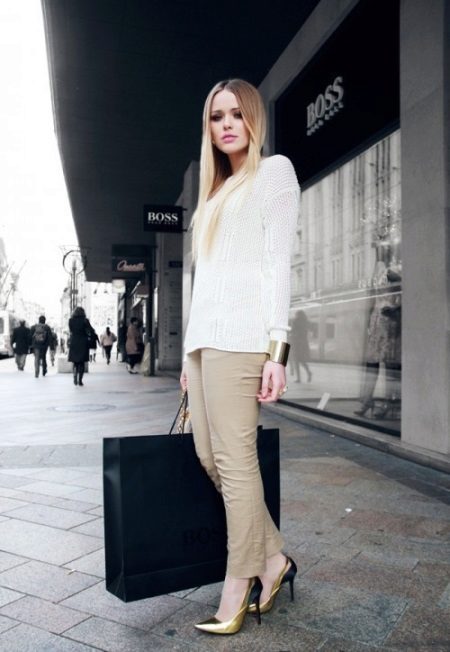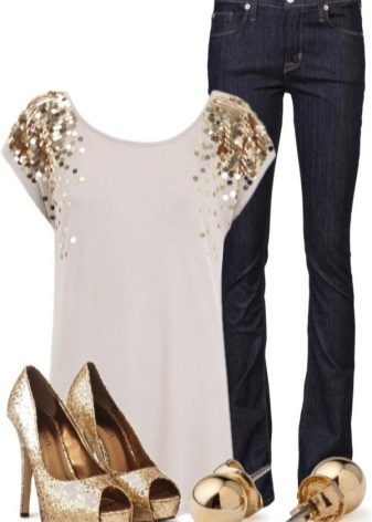 Gyldne sko til en konturdrakt kan vælges med enhver størrelse på hælen.Dette gælder især for buksesættet: under bukseben vil den lave hæl være usynlig, men meget behagelig, mens du skaber et smukt billede. Dette er en ideel løsning for forventningsfulde mødre såvel som dem, der har problemer med vener. Disse sko ser især smukke ud med sorte bukser.