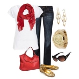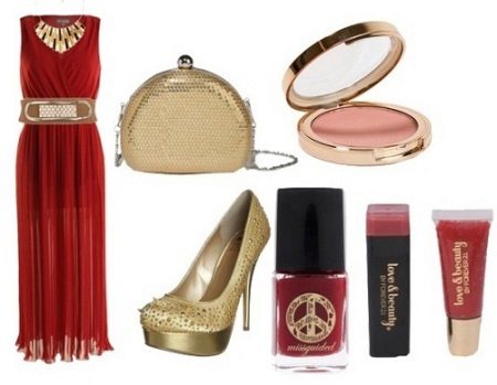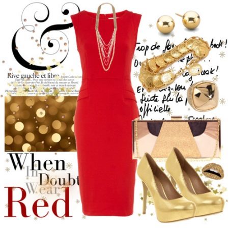 Spektakulære gyldne sandaler med tykke såler og høje hæle forlænger de allerede slanke ben og kombineres effektivt med en kort tunikjole i lys rød farve. En sådan skygge i tøj er meget velegnet til blondiner. Den lille håndtaske er lavet i en roligere skygge af rødt, og metalremmen gengiver farven på sandaler. Dette dristige og provokerende billede er kompetent afsluttet af solbriller.