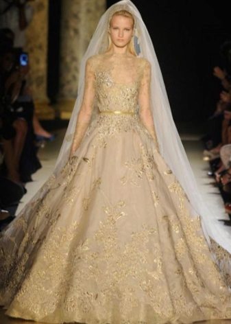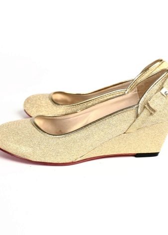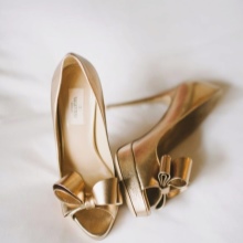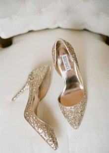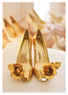 Peerless look i guldfarvet bryllupssko. Kun en guldskygge skal ikke være for mørk (tæt på chokolade). Til en lykkelig begivenhed tilrådes det at købe en sofistikeret model med en lille hæl eller flad sål. Hvis brudekjolen let åbner sine ben, er det bedre at tage gyldne sandaler med ankelstropper.