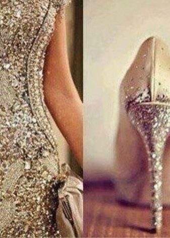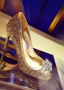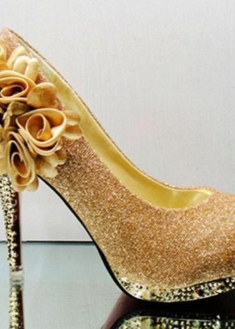 Guldfarvede sko, fuldt dekoreret med rhinestones, er designet til at skabe et rent romantisk billede. I denne form kan du optræde på scenen, iført en elegant, men ikke skinnende kjole.